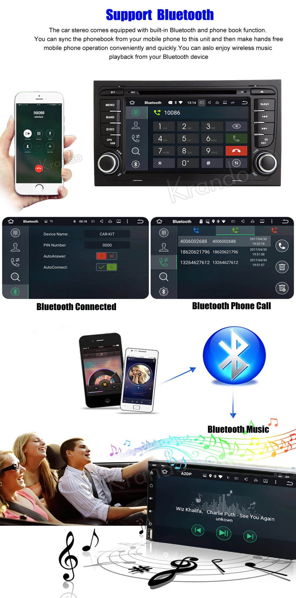 Krando Android 8.0 7'' 32GB ROM car radio for Audi AS s4RS4 2002-2008 DOUBLE navigation gps player Steering wheel control dab+ Fit Car Models: for Audi AS s4RS4 2002-2008 DOUBLE Important Note: Please check your original car dashboard and appearancebefore make a orderbid to avoid mistake,if you are not sure this unit fit for your car or not,please send your real car dashboard pictureto us,we will confirm it for you. Specifications General Information Operation System Android 7.1 CPU& Plaform RK3188Quad Core, Cotex A9,1.6GHz ,DDR3 2GB RAM,Built in16GBROM Menu(OSD) Languages Russian, English, Chinese, Spanish, Portuguese, Italian, French, Dutch, Turkish, Swedish, Norwegian, Polish, Japanese, Korean, Malayu, Indonesian (over 70 kinds) Standard Features Built in GPS Navi + FM/AM Radio + Bluetooth + Multimedia + USB+ AUX + WiFi, suport 3G ineternet,support Mirrorring Optional Access DAB+ Tuner; DVR; OBD II; DTV Box(DVB-T2/MPEG4/ISDB-T); RearCamera; Microphone... Display Display Digital TFT LCD Monitor 16:9 Resolution 1024*600 Touch Screen Capacitive Touch Screen Internet WiFi Built-in WiFi, 802.11b/g/n, compatible WLAN 3G Built-in 3G Module (Need Buy Extranal 3G DONGLE) GPS GPS ANT Chip MediatekMT6625 Map Storage Built-in Flash or SD Card Maps Support iGo, Navitel,Tomtom, Sygic, Google map online etc DVD if applicable(Full Touch Series no have this funtion) Type of Disc 12cm disc Compatible Disc DVD-Video, DVD-Audio, DVD±R/RW, DVD-ROM; CD-DA, CD-R, CD-RW; Video CD, DVCD Pick up HOP-1200XH (HITACHI) Multimedia 1080P Video Play Support USB 2 X USB Port; Video Format avi, mkv, mov, mp4, mpeg, mpg, rmvb, flv, H.265 ect. Audio Format MP3, WMA, AAC, RM, FLAC etc. Photo JPG, BMP, JEPG, GIF, PNG ect. Radio FM/AM Frequency FM: 65MHz74MHz; 87.5MHz108MHz; AM:522KHz1710KHz Pre-set Stations FM 3*6; AM 2*6 RDS Support Radio IC TEF6686 (Get a very stable and better signal) Bluetooth Bluetooth Ver. Bluetooth V4.0, Support A2DP, Bluetooth IC MT6625 Phonebook Support Microphone Built in (External Support) File Management Main Functions Support download, install and delete over thousands of android apps Official Software Edit Support read and edit Word/Excel/Powerpoint/PDF/TXT Communication Tools Skype, Gmail, Twitter, Facebook, VK etc 3D Games Support Hardware Specifications Working Voltage DC+10.8V--14.4V Max Power Output 4*45W AMP IC TDA 7851L (4*45W MOSFET quad bridge power amplifier - best sound quality) Working/Storage Temp. -25°-- +75°/ -45°-- +85° Our Services Warranty We provide one Year Warranty Service for the product.ONE Year Factory Warranty(accessories not included). Warranty will be voided as of: (1) Damage caused by: Undue wear & tear, dirt, misused, improper installation or operation, neglect, accident. (2) Any damages caused by improper packaging when buyers return the item to us. (3) If the item was disassembled or repaired by unauthorized person. Return and Refund All items are brand new straight from the factory. In case you receive a faulty item, please contact us within 3 days after sign on the receipt. We will refund or replace it. Return within 7 days after receipt can be refund (exclude shipping freight) Return within 20 days after receipt can be replaced. Return within 1 year from the purchase date can be repaired. It is the customers' responsibility to pay for return postage and ship the item back to us. We will send it back at our cost. All returns must be confirmed by our after service staff, we are not liable for any return package without prior notice. For non-defective returns, there will be administrative fee applied. Feedback *Ifyouarefeelhappyafteryoureceivedourproduct,pleaseleaveusa5startfeedback,yourpositivefeedbackwillbethebestdrivingforceforus. *Ifyouarenotsatisfiedwiththispurchase,don'topenadispute,pleasecontactuswithin24hours,wewillkeepintouchwithyoutilltheproblemsolved
