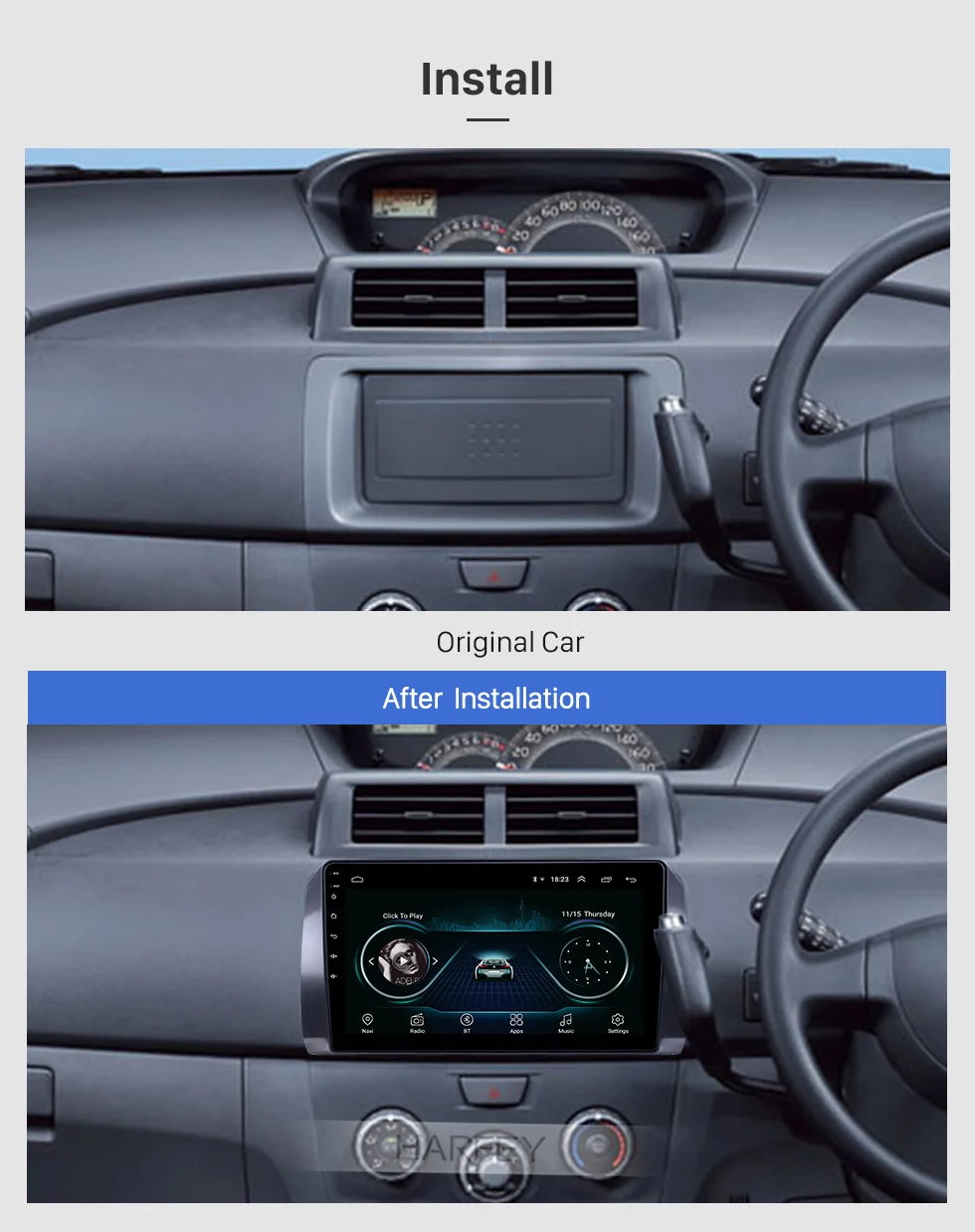 Harfey 2DIN Touchscreen GPS Car Radio for Toyota B6 2006/Subaru DEX 2008/Daihatsu WO 2005 10.1'' Android 8.1 support Carplay Overview ·3G&WiFi/App download/3D Navigation/Radio Tuner/Bluetooth/Dual Zone/ File Management/HD 1080P Video/Steering Wheel Control/Mirror Link/OBD2/DVR/Backup camera/MP3/AUX/USB/SD etc. Configuration ·OS: Intelligent pureAndroid8.1operation system. ·CPU: High quality MT8227LQuad-core 1.3-1.5GHzCortex-A7processor with great performance ·GPU: with Mali-600MP4 Quad-core GPU, It supports dual-screen display for the highest resolution of1280*800. ·Hard Disk:16 GBINand Flash ·RAM:1GBSamsung DDR3 ·Screen: multi-touch screen with smooth operation, high sensitivity and abundant interaction for the better view of your road ahead. ·UI: With exquisite and user-friendly user interface, you can set any of your favorite application icons as shortcut on the main menu and set the position of the icons according to your preference.